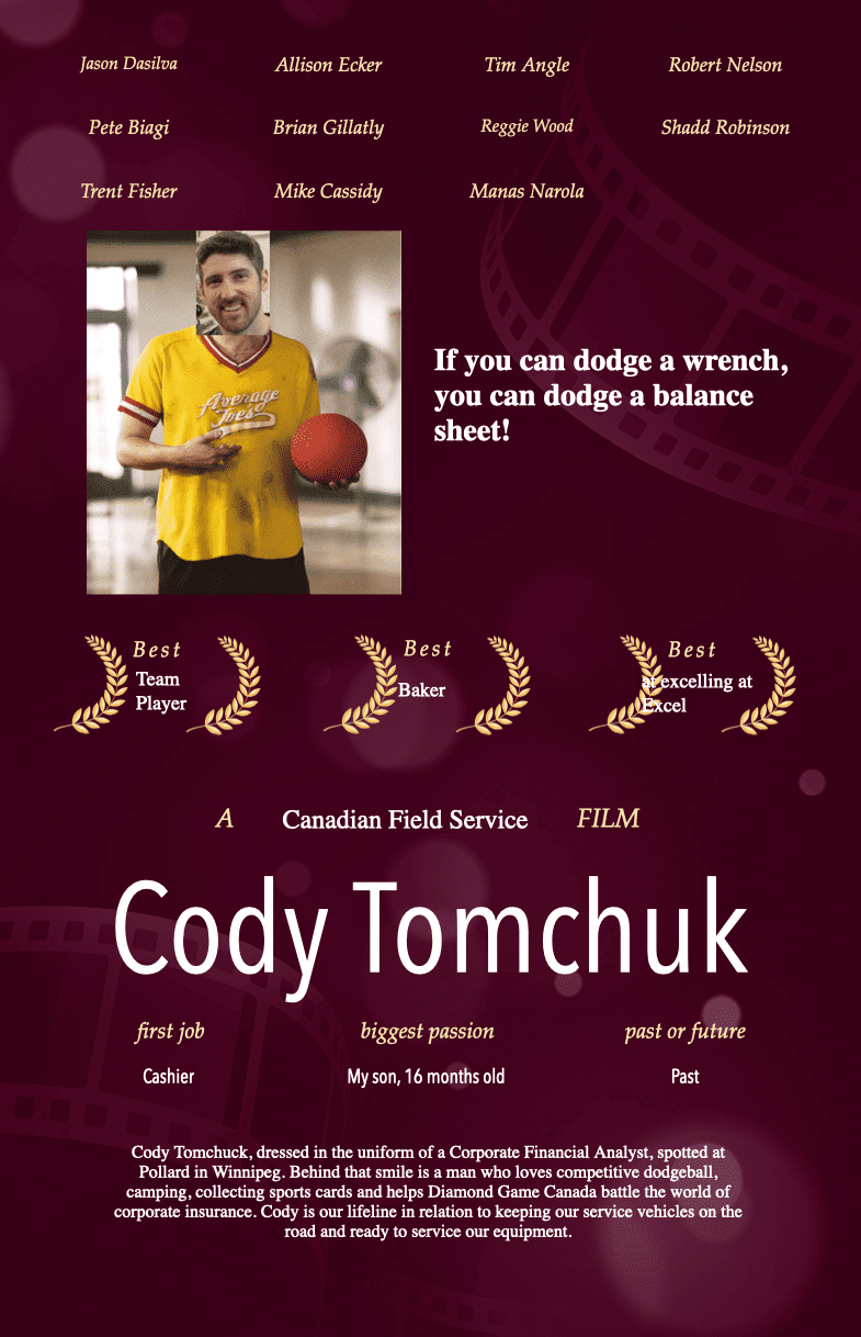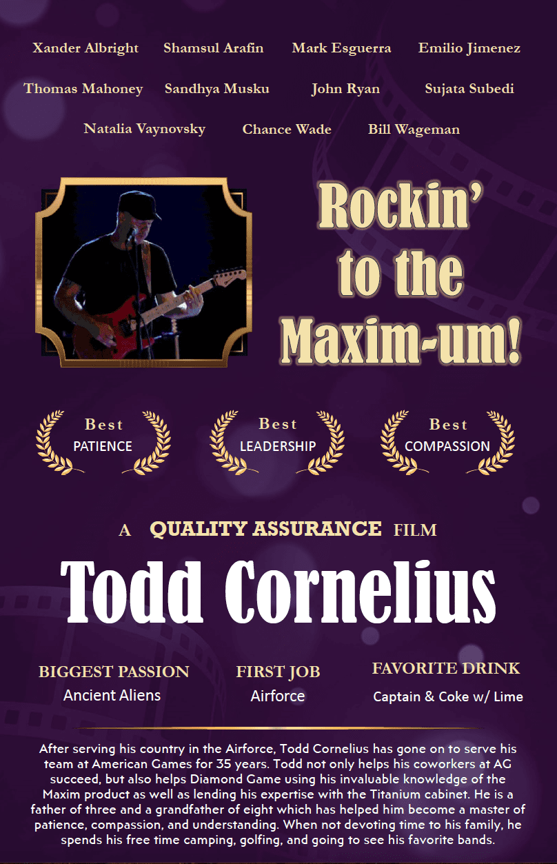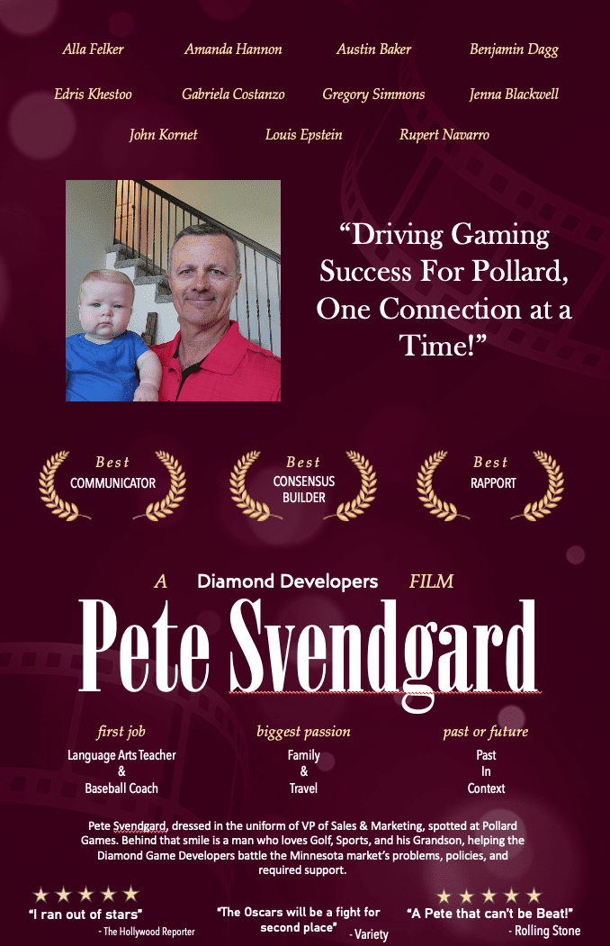 Meet The Cast Aaron Mancilla Product Manager, IG By: Creative Dev/Prod Man Kelly Harrison Product Director, Schafer By: Tech Serv/IT Deidre Koch Product Manager, Schafer By: Assembly/Press/Warehouse Pete Svendgard VP Sales & Marketing, IG/AG By: Software Dev Steven Fingold Executive VP, Charitable Gaming, Pollard By: Market Managers Todd Cornelius Director of Machines, AG/IG By: QA Dean Van De Walle Director of Creative Services Team, Pollard By: Software Dev 2 Cody Tomchuk Corporate Financial Analyst, Pollard By: CAN Field Serv Tammy Johnson Sales/Pull Tab Product Manager, AG By: Marketing/Biz Dev CONTACT US TERMS & CONDITIONS PRIVACY POLICY COPYRIGHT DIAMOND GAME ENTERPRISES. ALL RIGHTS RESERVED.